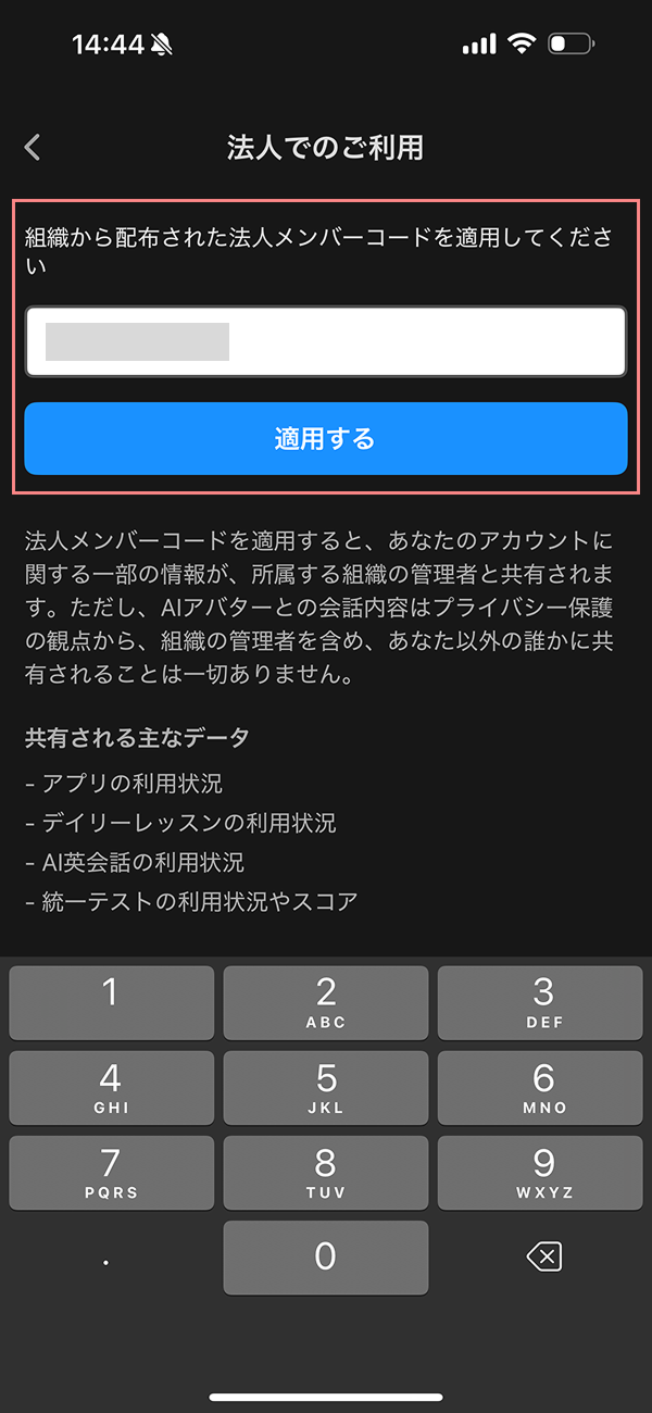 このコードは、アプリ内で法人プランを有効化するために必要です。