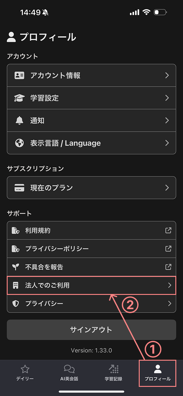 [プロフィール] > [法人でのご利用] をタップし、メールに記載された法人メンバーコードを入力してください。
