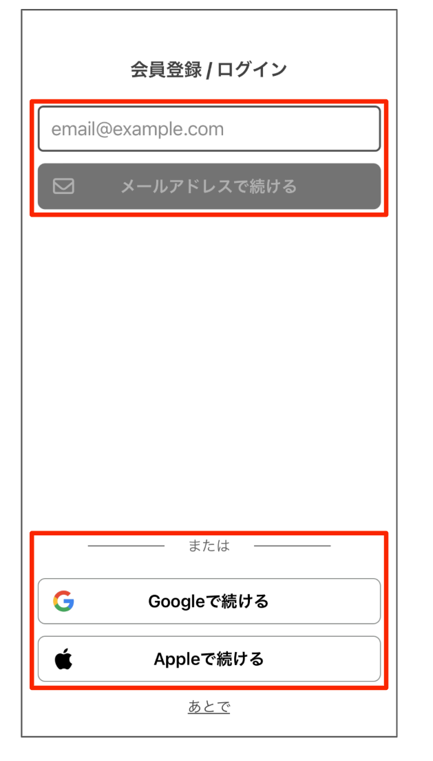 「メールアドレス」「Googleアカウント」「Appleアカウント」のいずれかの方法で、会員登録を行ってください。