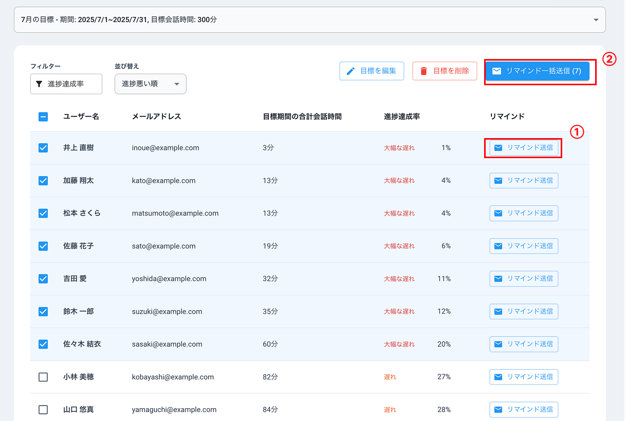 ①進捗の悪いユーザーなどにリマインダーメールを送信することができます。