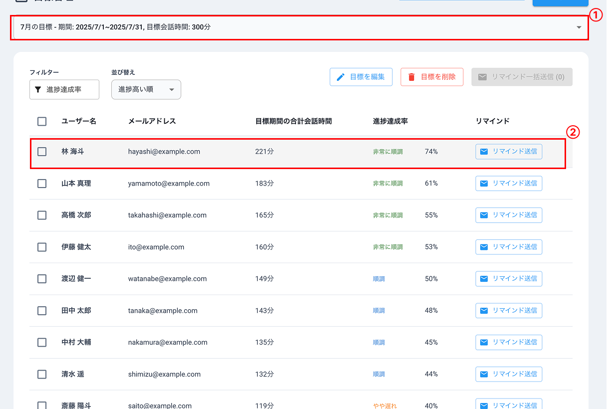 ②各ユーザーの目標期間内の合計会話時間、目標の達成率を確認できます。また現在の経過日数に応じて達成率の評価を表示します。