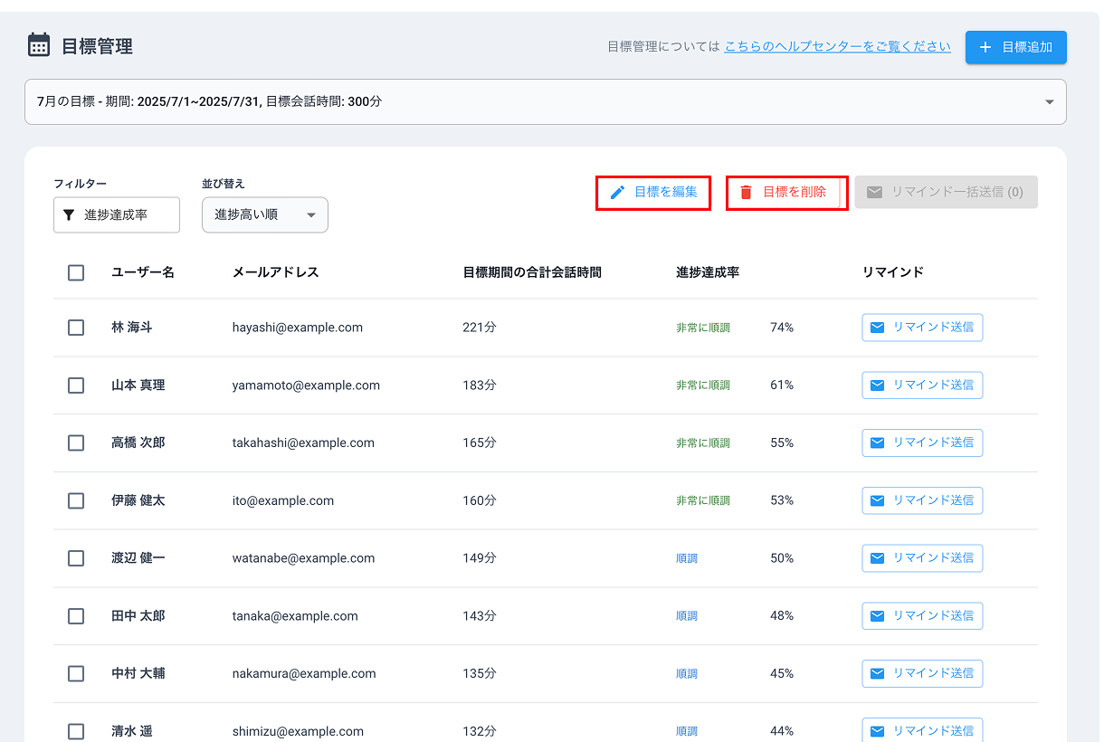 目標管理機能とは、管理者が目標をメンバーが一定期間内に達成すべき会話時間の目標を設定・管理することができる機能です。